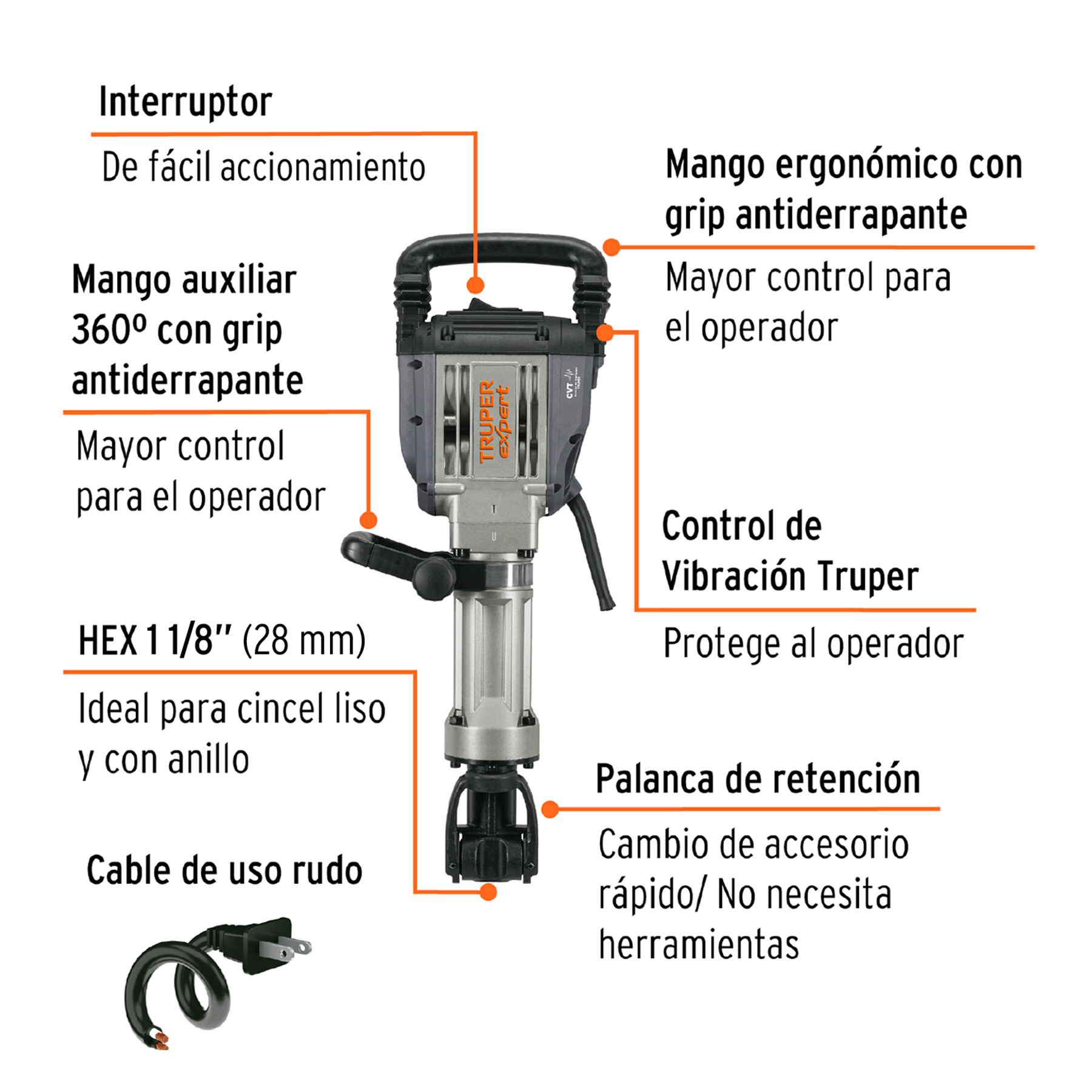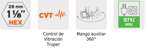 • Empuñaduras con sistema de Control de Vibración Truper (CVT) que reduce las vibraciones, haciendo el trabajo más confortable y seguro para el operador