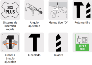 • 4 Funciones: rotomartillo, cincelado, taladro y cincel + ángulo ajustable